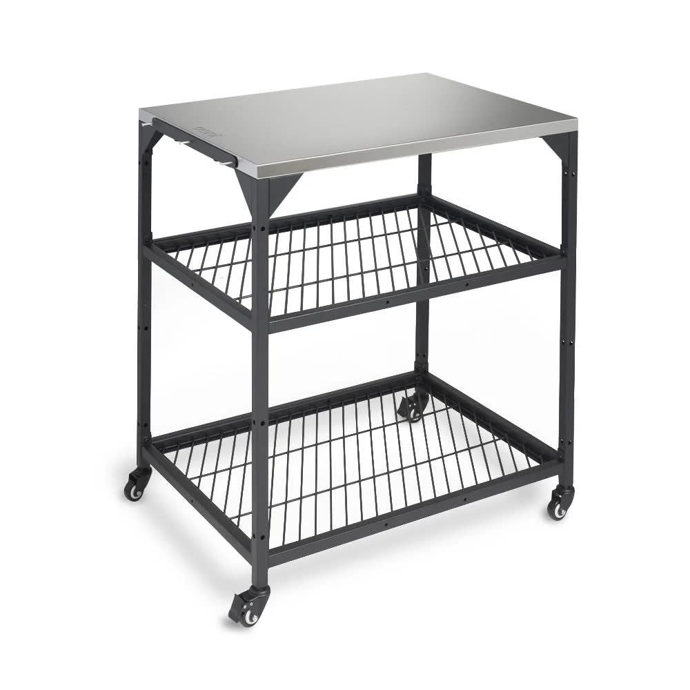 Our tables are made of robust powder-coated carbon steel. They also feature two height-adjustable shelves and built-in hooks for your Ooni peels and accessories. Plus, the two lockable castors will keep your table steady while you cook.