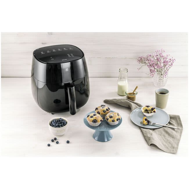 The ZWILLING hot air fryer conjures up savoury and sweet dishes in no time at all. Crispy fries, pizza, muffins and much more can be easily prepared in it. You can fry in the fryer without fat or oil or with only a little fat, but also cook and bake.